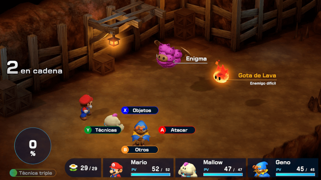 Adicional tenemos un contador que ira aumentando cada vez que ataques o defiendas correctamente sin necesidad de ser perfecto, este contador aumentara tus estadísticas entre mas ataques o defensas contabilices en base a los personajes que estén en combate además de llenar el medidor que te servirá para realizar ataques triples, lo cual es otra novedad de este remake, dependiendo de los 3 personajes en combate podrás realizar un ataque triple que va desde hacer daño a uno o a todos los enemigos a protegerte por un turno o subir tus estadísticas temporalmente.