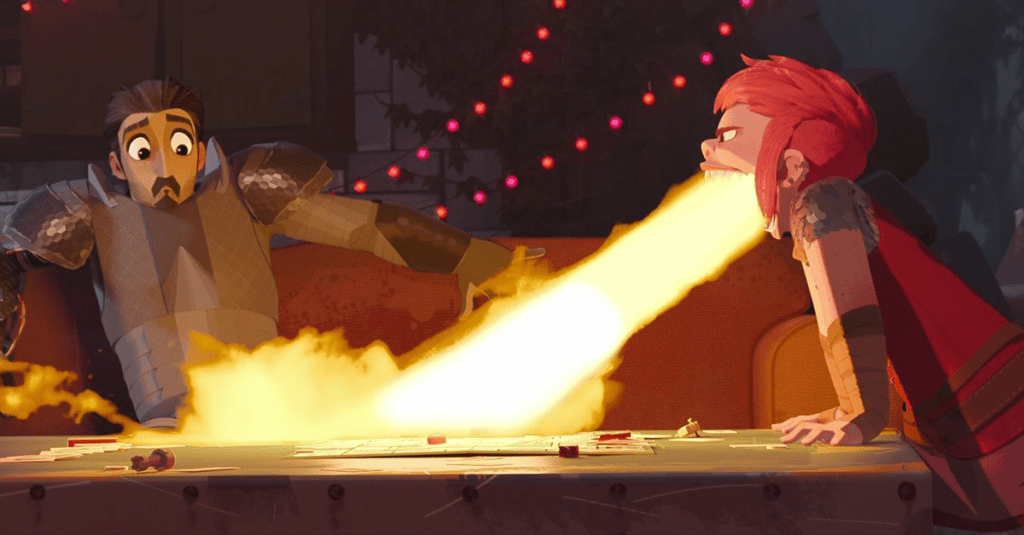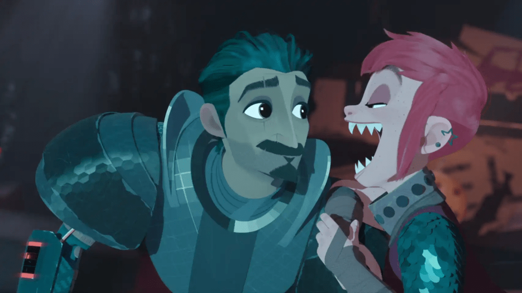 La animación es sumamente excelente y fluida en especial las escenas de acción con Nimona y sus múltiples transformaciones haciéndola visualmente hermosa y bastante interesante de ver, los diseños de los personajes están muy bien y son bastante diferenciables entre todos, de lo mejor en este apartado.