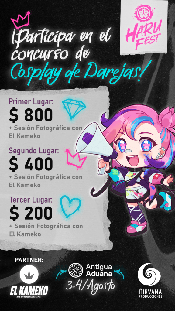 Nirvana Producciones nos traen un año mas una nueva edición de su evento Haru donde se nos promete una nueva experiencia en eventos con actividades mucho mas interactivas con los asistentes donde se sacara el lado mas artístico de todos. Además de tener stands comerciales y artísticos habrán múltiples actividades donde podrás mostrar tu lado mas artístico en distintas disciplinas como baile, dibujo, entre otros, dándole un lado mas urbano con grafitis y demás.