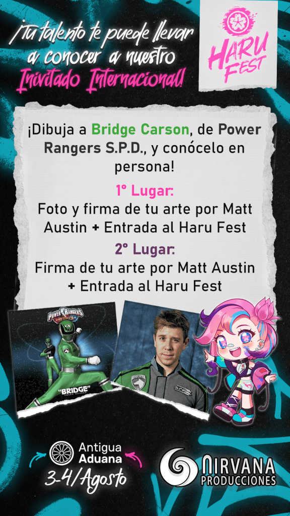 Fanart de Bridge Carson de Power Rangers S.P.D concurso antes del evento donde deberás dibujar al personaje con alguno de sus trajes de ranger, se puede hacer con cualquier técnica de dibujo y para participar solo se debe subir a Instagram y etiquetar a @haru.fest con el hashtag #Harufest2024, hay tiempo hasta el 25 de julio. Se anunciara el ganador el 27 de julio. El arte sera evaluado por los jueces del evento.