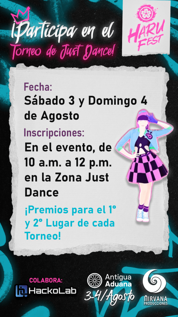 Concurso Just Dance para todo el publico que se llevara a cabo ambos días, las inscripciones serán los días del evento de 10 AM a 12 MD empezando el torneo a las 12:30.